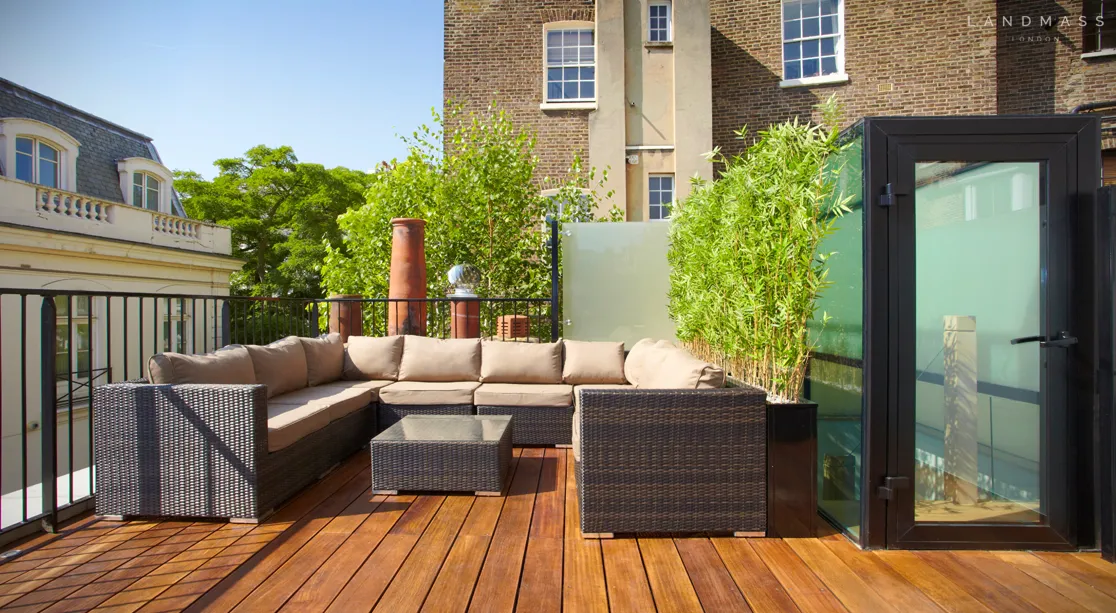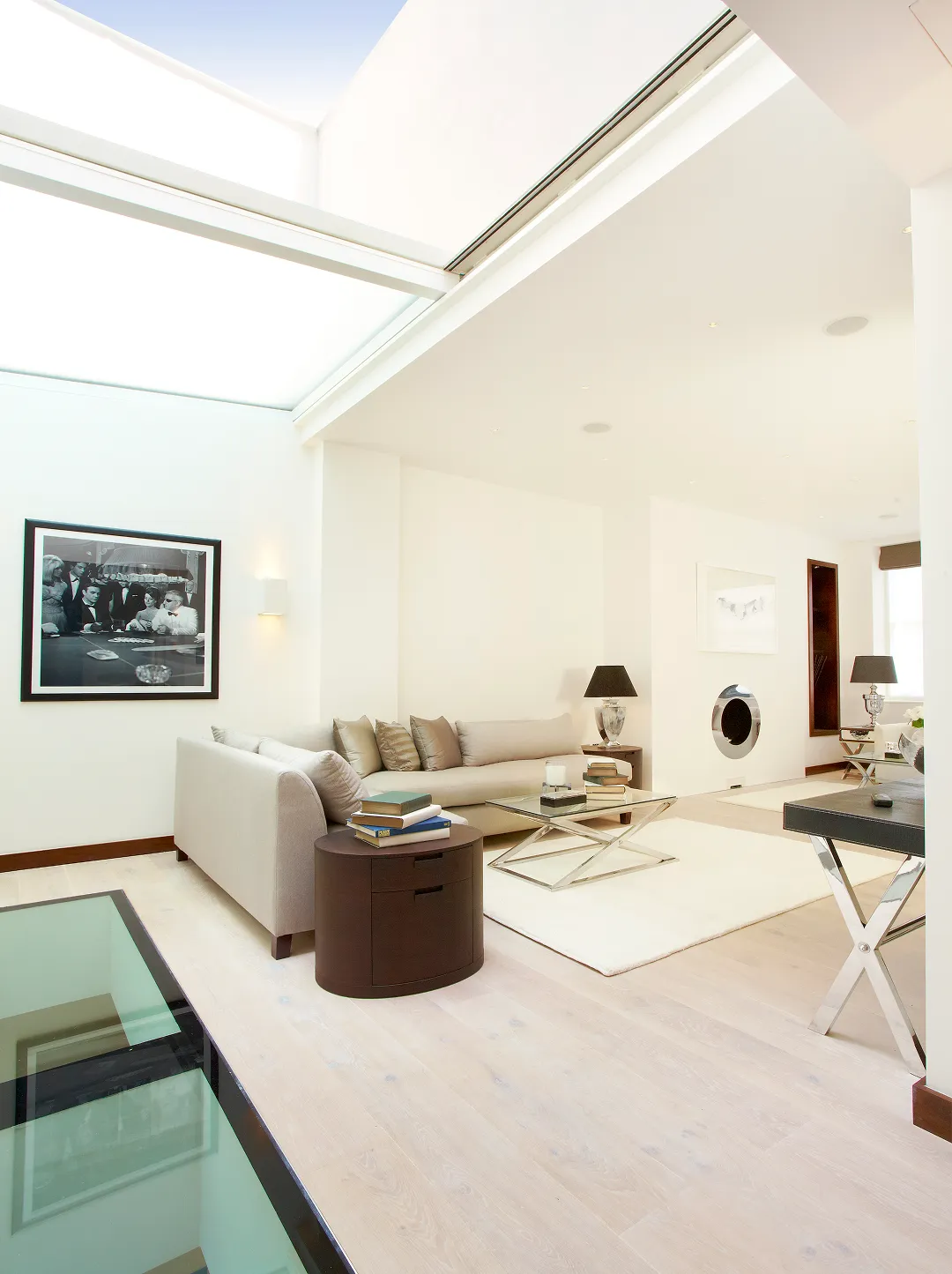This Victorian house has been reconfigured into a contemporary three-bedroom, three-bathroom home, featuring a stunning south-facing roof terrace overlooking Belgravia. The thoughtful use of natural light creates an exceptionally bright interior, enhanced by a retractable glass ceiling above part of the reception room. Glass flooring beneath allows light to cascade into the expansive lower ground floor, which boasts an impressive 3.2-metre ceiling height.
