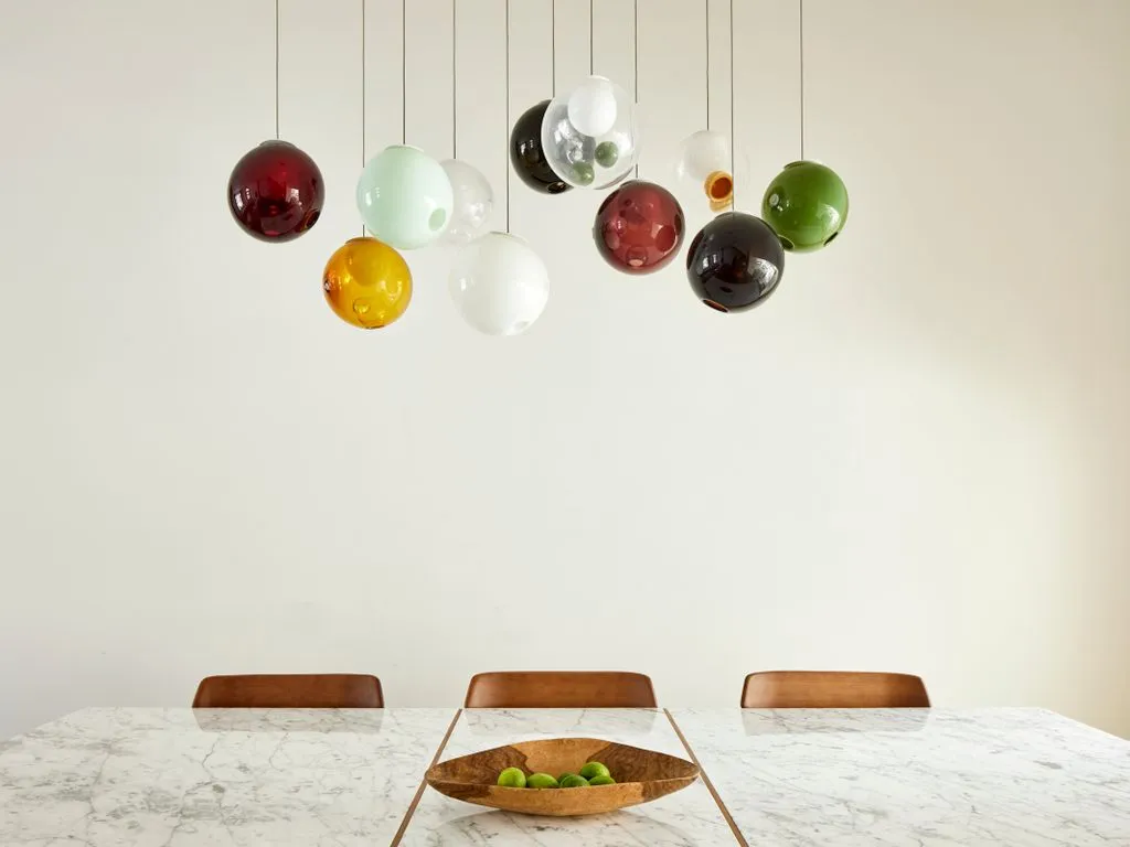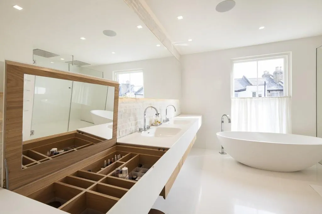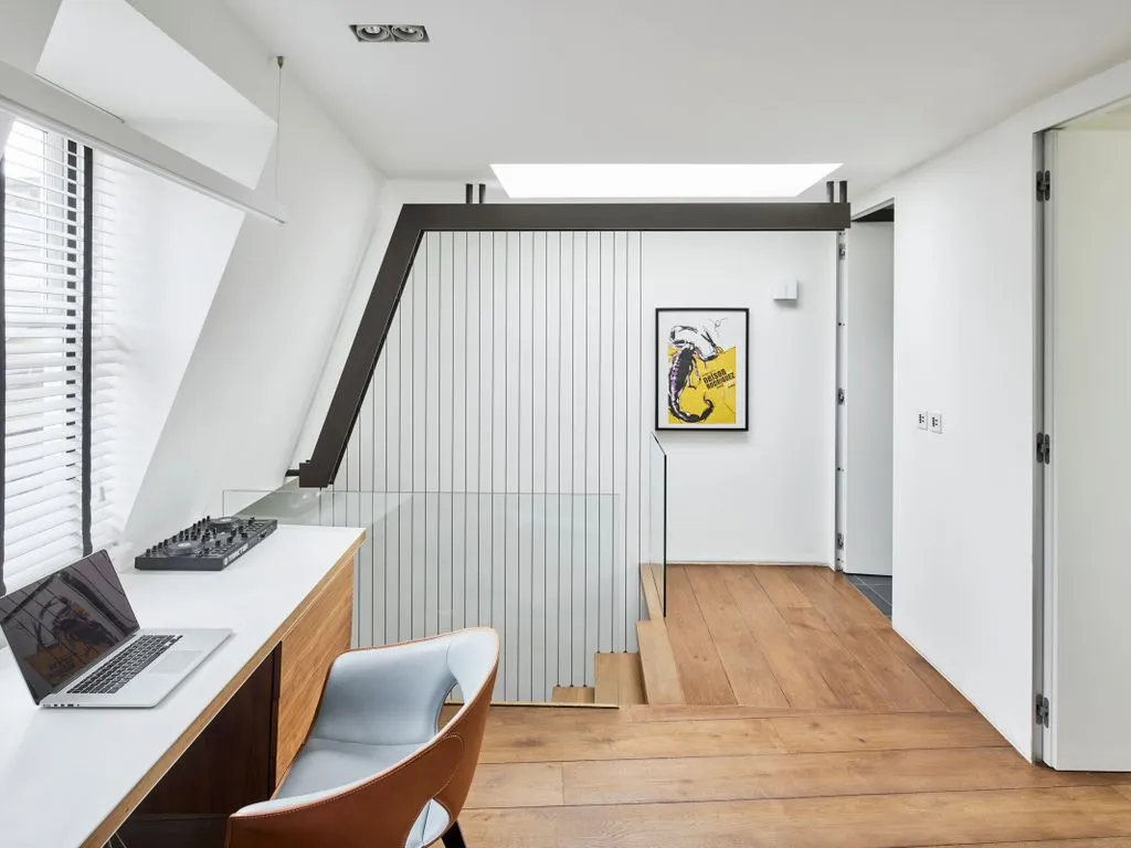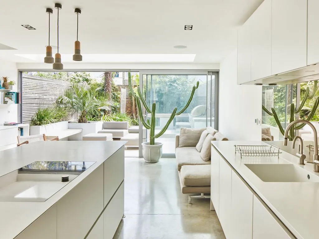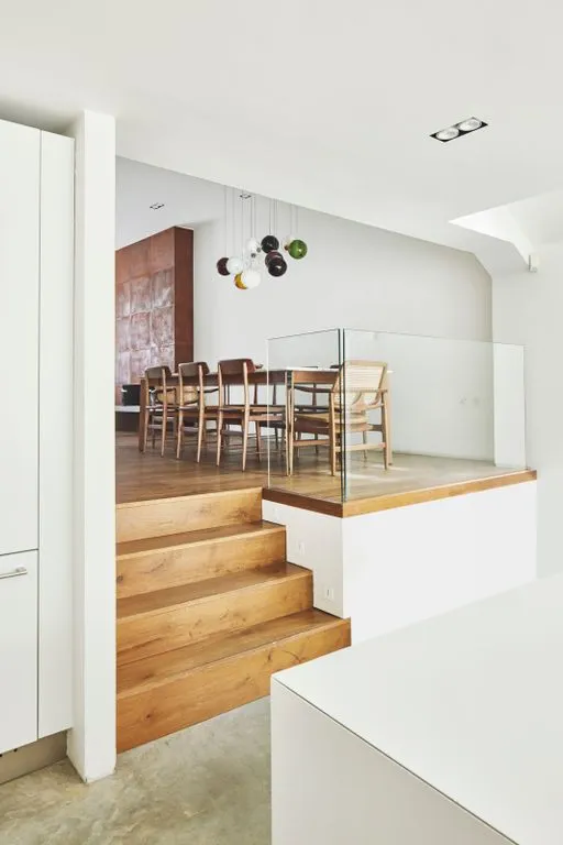 The ground floor’s original warren of small rooms was opened up to create a stunning split-level living area spanning over 50 feet. The upper level accommodates the formal living and dining spaces, while the lower level—featuring skylights and sliding doors that open onto the garden—houses the kitchen and informal living area.