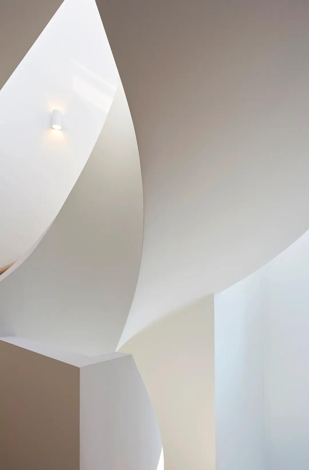 Spread across five floors, including a double basement, the home is filled with natural light streaming in from multiple courtyards, which also provide inviting outdoor spaces. The striking spiral staircase, extending from top to bottom, serves as the defining architectural feature of the house.