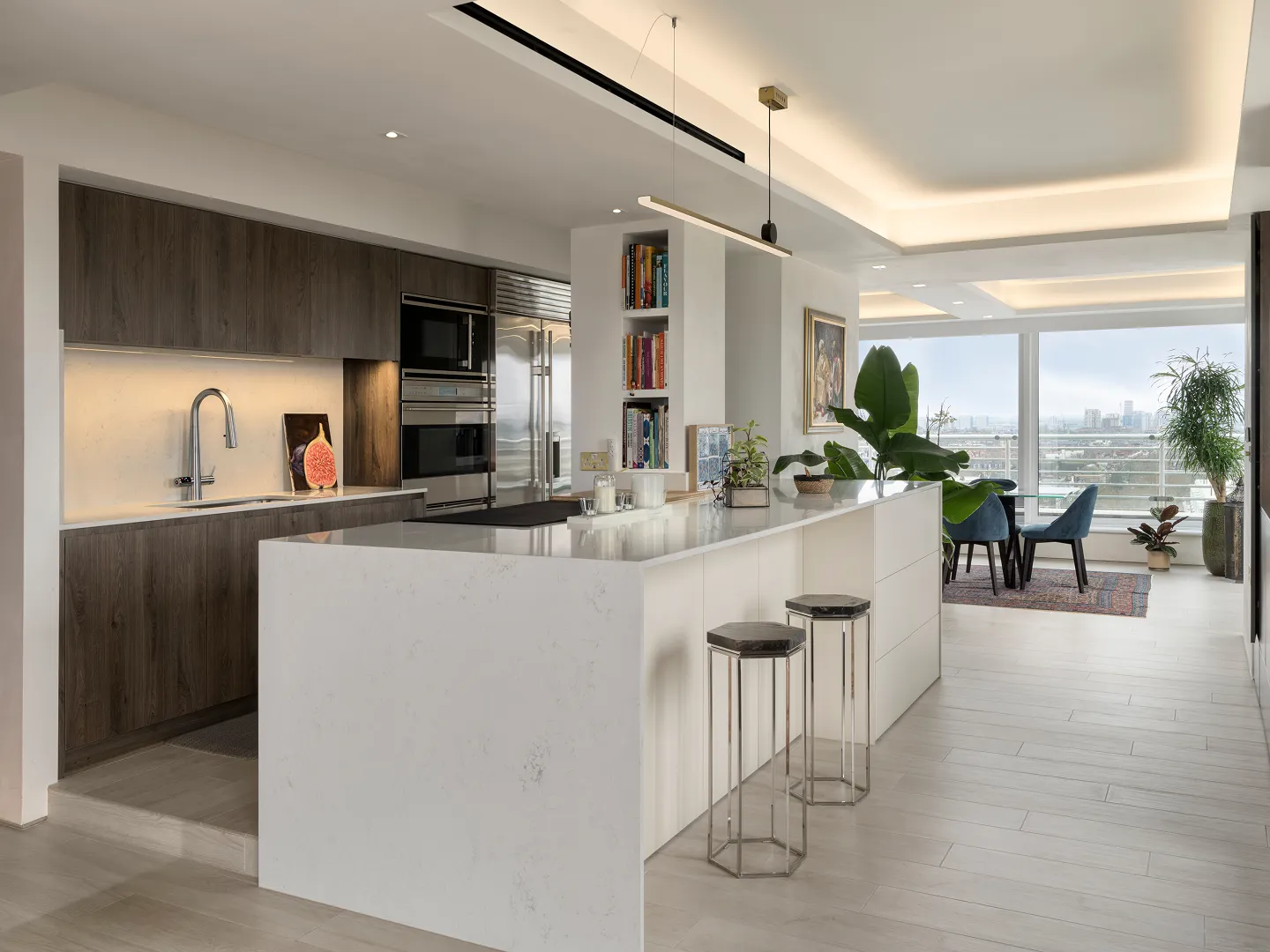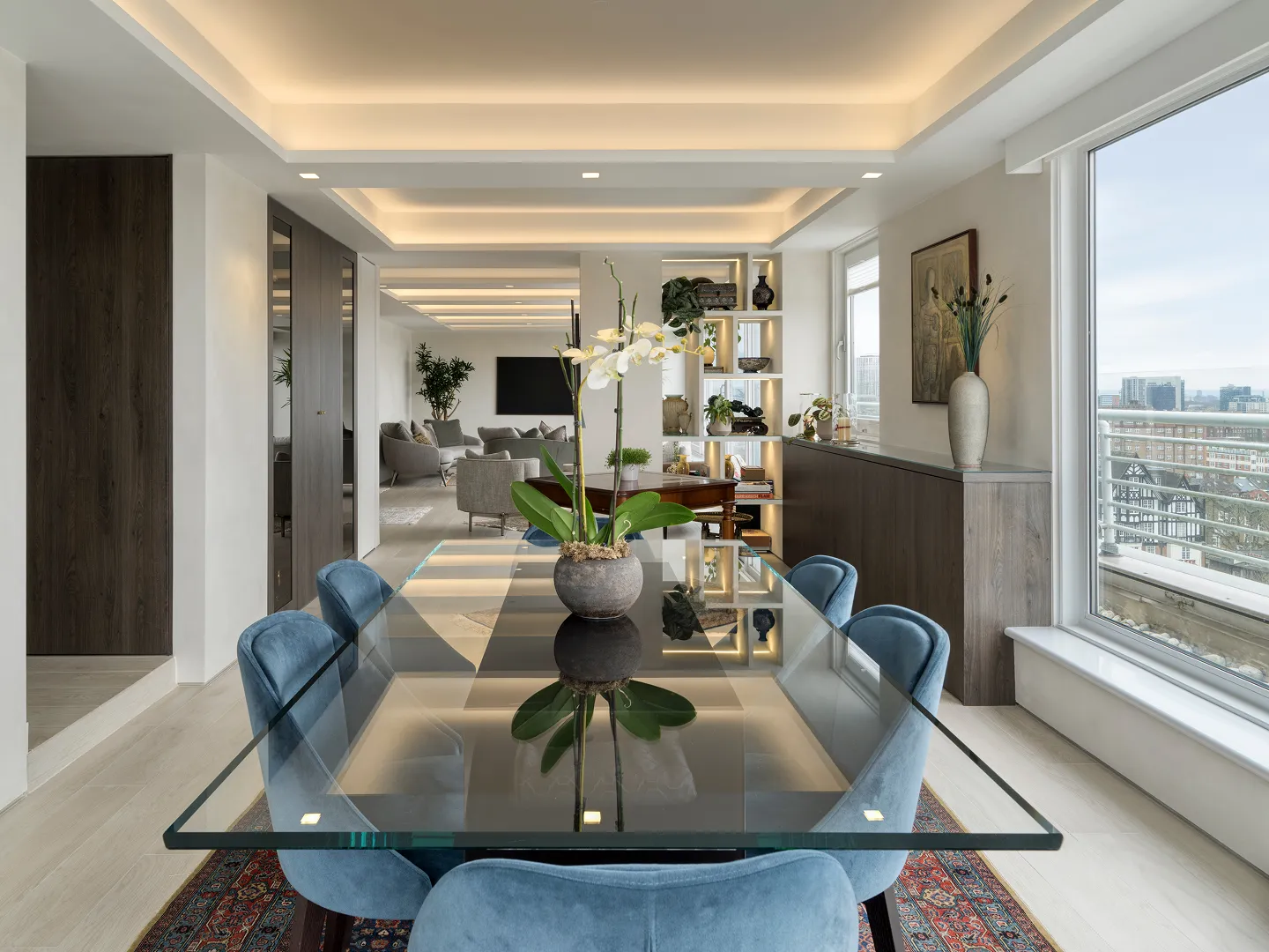 Following a complete strip-out, the entire floor was thoughtfully reconfigured to create a layout that complements the clients’ daily routine. The result is an exceptional family penthouse—open and connected, defined by a soft, neutral palette. Generous floor-to-ceiling windows flood the space with natural light and frame panoramic views of London’s skyline. Living areas flow seamlessly into one another, while bespoke furnishings, diffuse lighting, and natural textures establish a calm, contemporary aesthetic.
